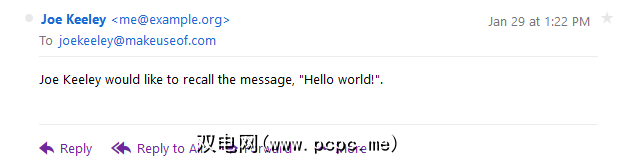 请注意,在您从组织外部发送到Gmail或Yahoo帐户的电子邮件中,撤回将不起作用。这是因为一旦电子邮件离开您的内部服务器,您就无法对其进行控制。没有通用的规则要求电子邮件服务器应遵守召回要求;实际上,它甚至都不会得到处理。