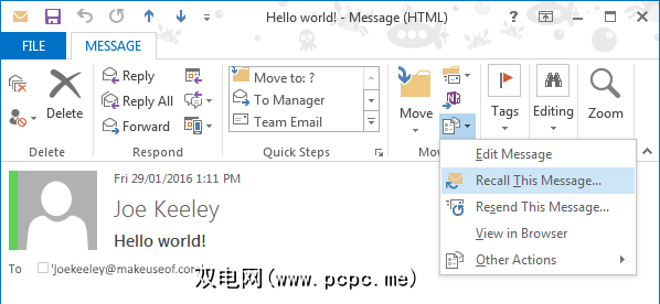 尝试在Outlook中重新调用邮件非常容易。首先,导航到您的已发送邮件文件夹,然后打开要撤回的邮件。从功能区中,确保已选择消息标签。然后,在移动组中,单击动作(根据您的窗口大小,该动作可能会折叠成一个图标)。从出现的下拉列表中,选择调用此消息…。