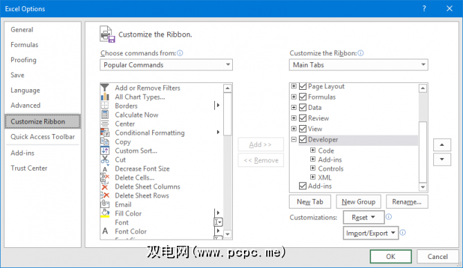 要启用它,请转到文件>选项>自定义功能区。在自定义功能区列中,在下拉菜单中选择了主选项卡,勾选开发人员,然后单击确定。<