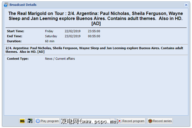 http://username:password@YourIPAddress:9981/playlist/channels要通过网络门户录制电视,请在< strong>“电子节目指南" ,然后单击第一个图标(带有“ i"符号)以显示有关它的信息。