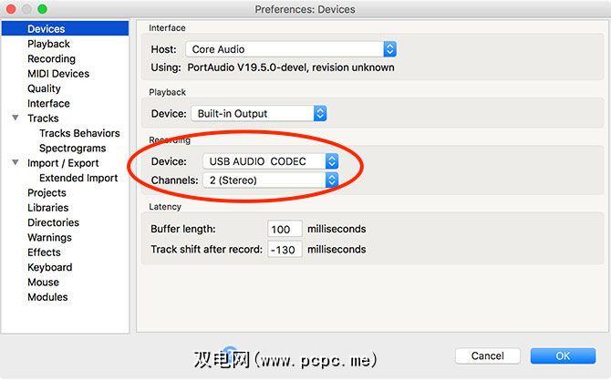 打开Audacity并访问首选项,然后在其中单击 Devices 左侧菜单。从录音下拉列表中,选择您的唱盘或USB音频设备(如果未显示,请确保已连接并打开电源,然后重新启动Audacity)。