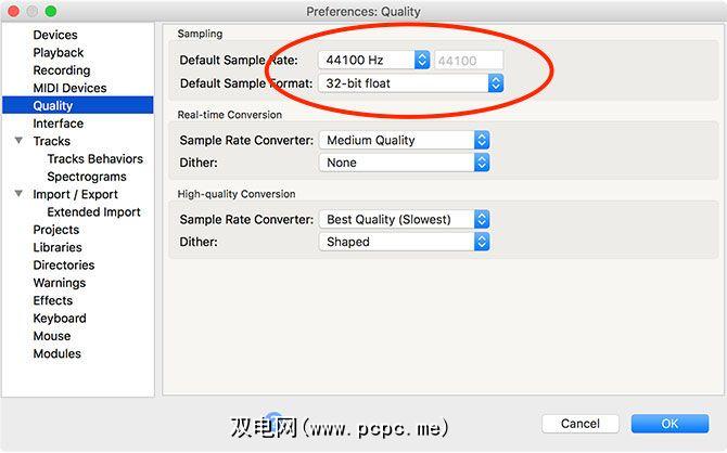 最后,在菜单中单击质量菜单。建议您对新的录音使用默认的Audacity设置。确保默认采样率设置为 44100 Hz ,并且默认采样格式设置为 32位浮点
