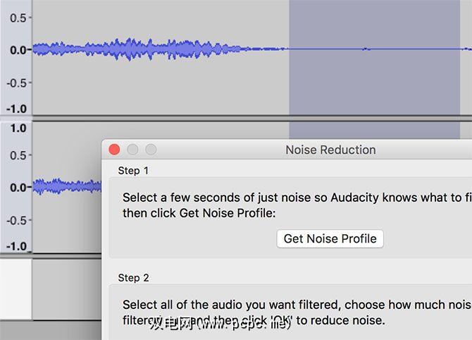 去掉是您可以使用的另一种工具。当只有背景嘶嘶声可以听见时,请先选择音轨之间的几秒钟音频。然后转到效果>降噪,然后单击获取噪声配置文件。