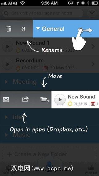 Recordium的设计很好,可以将您的录音标签和管理到现有的或自定义文件夹。当您将音频文件向右滑动时,它将显示用于将文件导出到其他支持应用程序的选项,包括Dropbox应用程序。您还可以通过电子邮件发送所选文件,重命名标题,将文件移动到所选文件夹或将其删除。