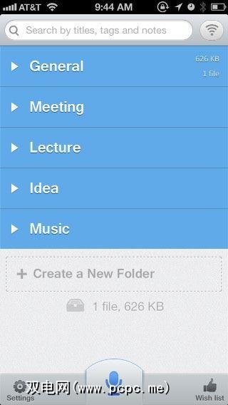Recordium打开时简单干净的界面。它已设置了,其中有一些默认文件夹,用于记录用户可能捕获的录音类型(演讲,会议,想法,音乐)。轻按主页底部的蓝色小录音按钮可立即将Recordium变为可注释记录的动作。
