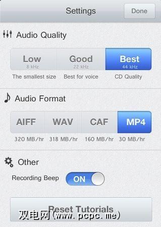 该应用的首选项允许您更改录音的音频质量从最佳的 CD质量到可识别存储的 Low 。 Recordium支持AIFF,WAV,CAF和MP4音频文件格式。在设置中,您还可以重置教程,以便在使用应用的不同部分时弹出说明性图像。