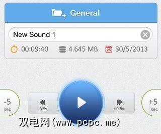 您可以在打开的屏幕上点击并播放Recordium记录。 。轻按录音上的向右箭头按钮将带您进入播放页面,并且如您所期望的那样,在这样的高级应用程序中,您可以向前或向后跳过五个秒间隔。