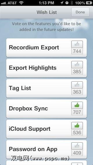 最后,Recordium并没有要求您对应用程序进行评分,而是提供了一个愿望清单按钮,表明开发人员肯定希望响应该应用程序用户的需求。实际上,您可以对应用程序已请求的功能进行投票,包括Dropbox Sync,iCloud支持,密码保护和标签列表。