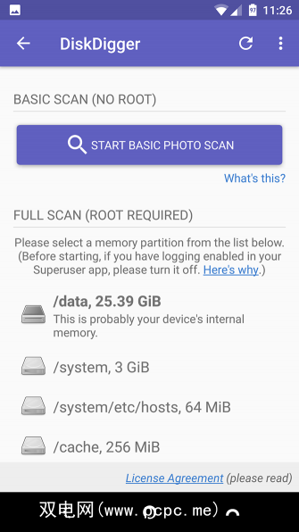从Play商店安装应用DiskDigger Photo Recovery。这是免费的照片和视频恢复;您只需要付费即可恢复其他类型的文件。