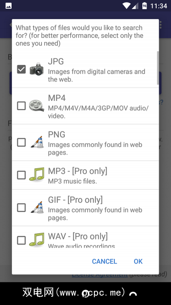 查找手机的内部存储空间。通常是 / data 分区。点按它,然后选择要搜索的文件类型(可能是 JPG 和/或 PNG )。点击确定开始。