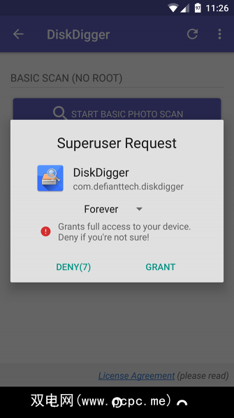 启动应用并在出现提示时授予root权限。现在,您将看到基本扫描和全面扫描选项。忽略第一个,因为它只能找到图像的低分辨率缩略图。相反,请关注完全扫描选项。