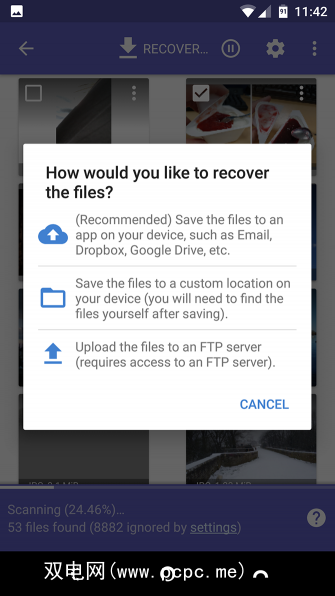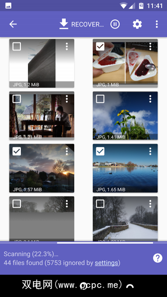 DiskDigger找不到所有删除的照片,有些可能已损坏。当确实找到所需文件时,请选择它们并点击恢复。