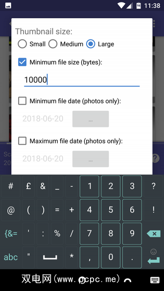 要过滤掉某些发现,请点击设置图标。设置更大的最小文件大小(例如,选择 1,000,000 ),将结果限制为大于1 MB的图像。您还可以将日期限制为拍摄照片的时间。
