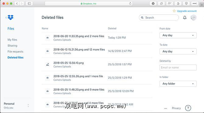 在Dropbox中,您需要登录到桌面恢复已删除的图像。您无法在应用中执行此操作。转到文件>删除的文件,然后选择要还原的文件。它们在删除后的30天内可用。