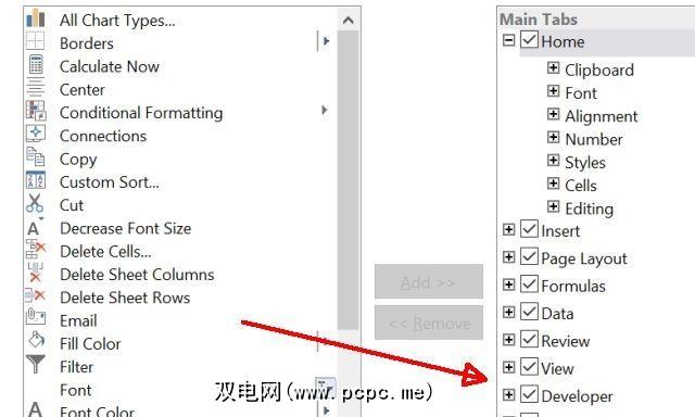 如果看不到“开发人员"选项卡,请转到文件>>选项,然后自定义功能区。现在将 Developer 命令组从左窗格移到右侧。