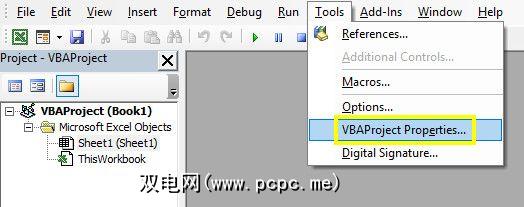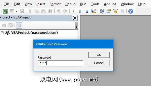 在Excel中打开文件。转到“开发人员"选项卡,然后单击“ Visual Basic",然后尝试访问“项目"菜单。您应该会看到密码提示,如果幸运的话,正确的密码应该是我们在虚拟文档中设置的密码。