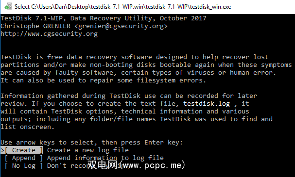 运行名为 testdisk_win.exe 的文件>。该应用程序将在DOS窗口中启动。您应该会看到类似以下的屏幕。