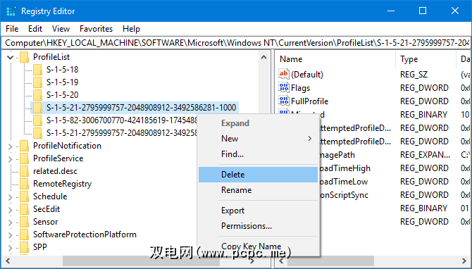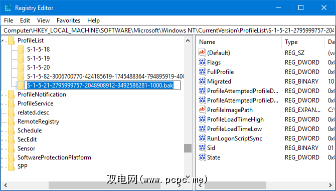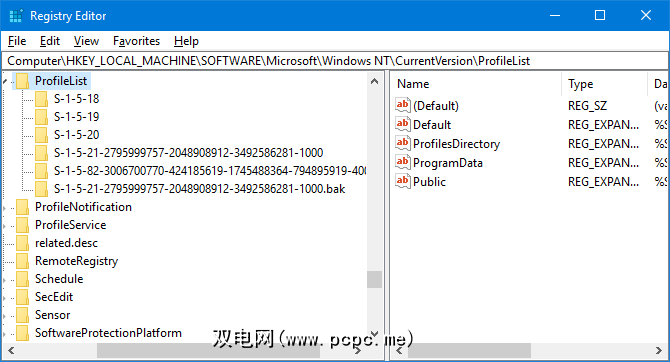 Computer\HKEY_LOCAL_MACHINE\SOFTWARE\Microsoft\Windows NT\CurrentVersion\ProfileList在左侧窗格中,您将在ProfileList文件夹中看到一个SID列表。