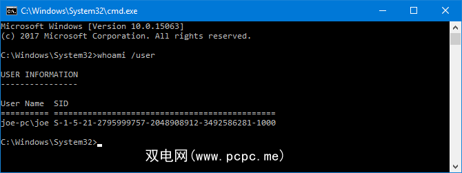 下一步,键入 whoami / user ,然后按 Enter 。此命令查询系统,以告诉您当前帐户的SID。