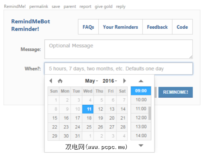 Reddit著名的u / RemindMeBot允许您回复任何评论或发布以创建带有单词“!RemindMe 5 days"(不带引号)的自定义提醒。 )。显然,您可以将天数更改为几周,数月或数年,并将数字更改为您认为合适的数字。