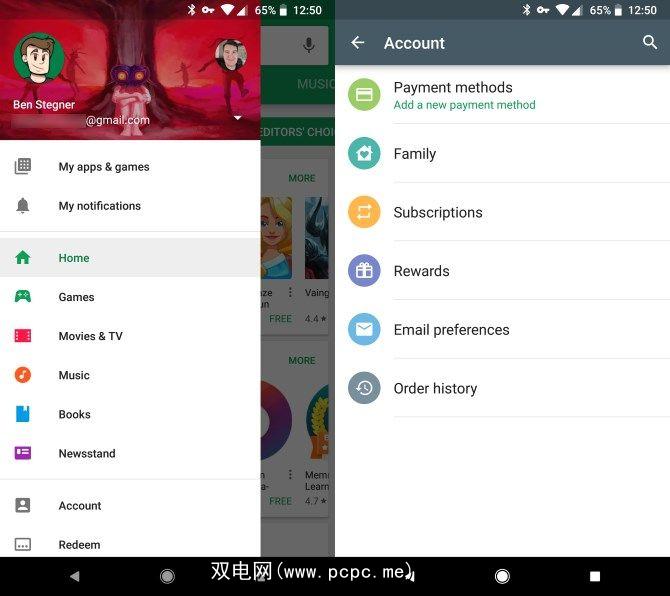 点击付款方式链接, strong>帐户页面,您会看到在 Google Play余额下有多少信用。