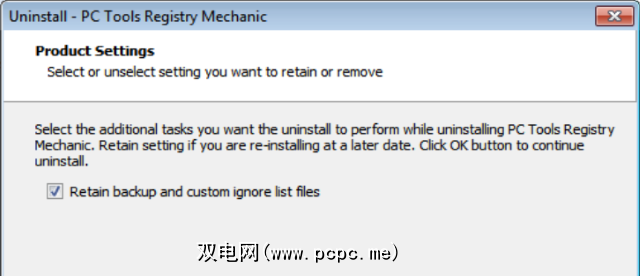 选择该项目,然后单击卸载按钮并按照向导中显示的说明进行操作,确保清除复选框以保留备份和自定义忽略文件列表强>。您应该重新启动Windows才能完全删除Registry Mechanic。