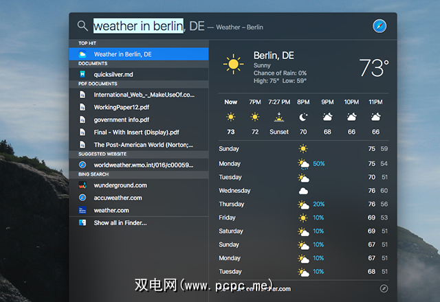 本月晚些时候,El Capitan将为Spotlight引入新功能,让任何人都可以搜索实时体育比分(搜索球队名称可以带来比分)以及时间表)或来自网络的信息(“柏林天气")。