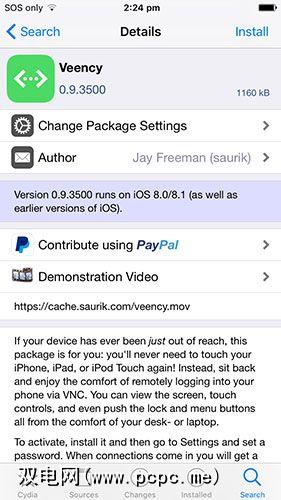手握越狱的iOS设备,启动 Cydia ,并根据需要更新所有存储库。在搜索选项卡上,键入“ Veency",然后点击相应的结果。点击安装,然后点击继续。 Veency完全可以免费安装和使用。