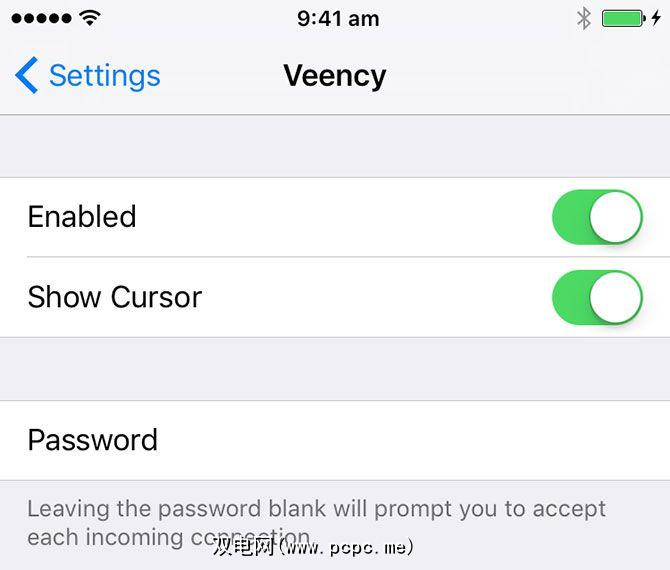 安装完成后,点击重新启动Springboard ,然后等待Cydia完成它。现在,您将在设备的设置应用中找到一个Veency条目。您可以打开或关闭服务器,选择显示光标并设置密码(这是个好主意)。