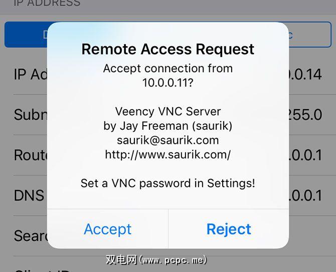 这可以归功于Cydia的一项名为Veency的调整,顾名思义就是VNC服务器。 VNC代表虚拟网络计算,它提供了一种共享显示内容并将控制权交给第三方的方法。 Apple并未将此功能烘焙到iOS中(可能是由于潜在的滥用),并且您在App Store上找不到任何VNC服务器。
