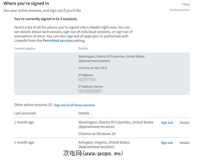 LinkedIn还可以轻松查看所有活动会话并注销: