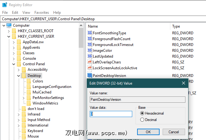 第二个是注册表编辑。该指令指示您找到一个名为 PaintDesktopVersion 的密钥,并将其设置为 0 。但是,此值通常已经设置为 0 (包括在我们测试的未激活的Windows 10计算机上),因此不会产生任何影响。