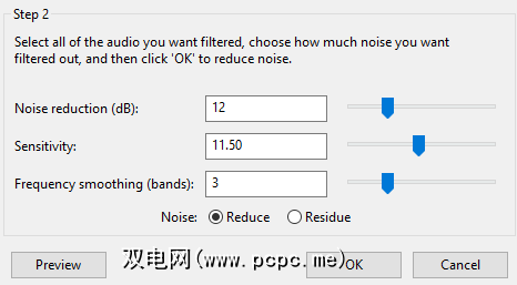 现在,返回到效果>降噪,然后查看步骤2 。在大多数情况下,默认的“降噪",“灵敏度"和“频率平滑"设置将起作用。继续并单击确定接受这些。
