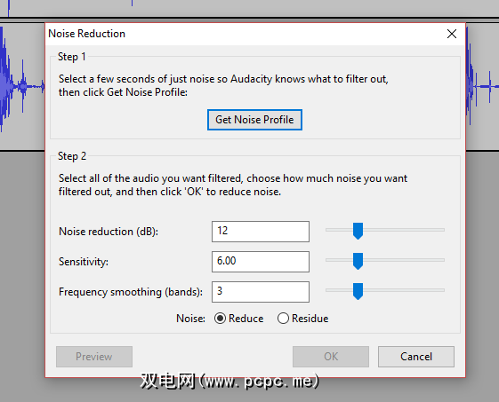选择音频(将以蓝色突出显示),打开效果>降噪功能。您会看到一个包含两步工具的对话框。首先,进入步骤1 ,然后点击获取噪声配置文件按钮。您已经选择了配置文件,因此请单击此按钮。