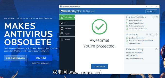 如果您不希望使用完整的防病毒软件,那么MalwareBytes防恶意软件是一个很好的选择。如果您浏览安全论坛和有关恶意软件清除的讨论,那么MalwareBytes通常是第一个建议。它可以扫描所有类型的恶意软件并自动将其删除。