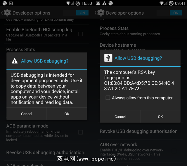 下一步,通过打开 Settings> Developer Options,在Android上激活USB调试。 选中该框,然后花时间阅读生成的消息并确认操作。请稍等片刻,然后再从PC确认RSA密钥指纹,然后选中始终允许来自此计算机框以保持稳定。