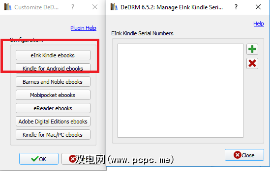 双击DeDRM列表,选择电子墨水Kindle电子书,然后添加设备的序列号。在大多数Kindle上,您都可以在设备的设置菜单中找到序列号。