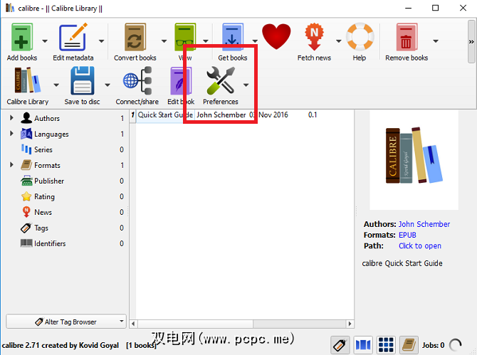 下载文件并解压缩其内容。现在返回Calibre,然后单击顶部菜单上的“首选项" 图标。