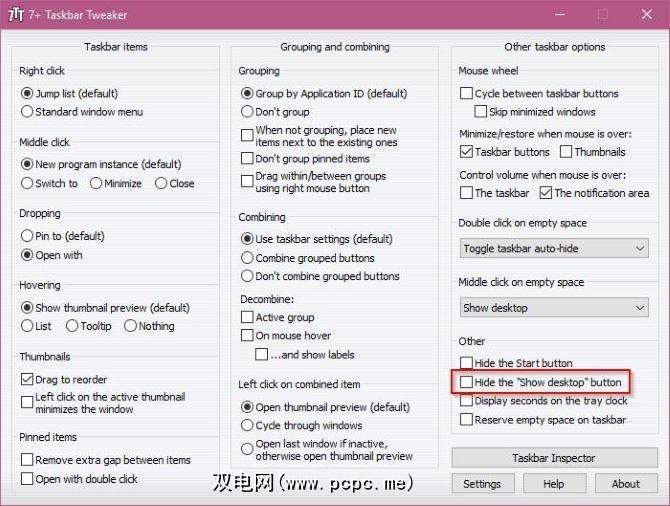 下载并安装此工具(如果需要,可以将其安装为便携式应用程序)。打开后,您应该在 Other 标头下的右下角看到一个名为隐藏“显示桌面"按钮的选项。进行检查,您将不会再看到该Peek点。请注意,您可以将相同的功能与Windows 10 / 8.1中的键盘快捷键 Windows键+逗号或Windows 7中的 Windows键+空格一起使用。