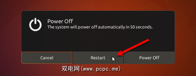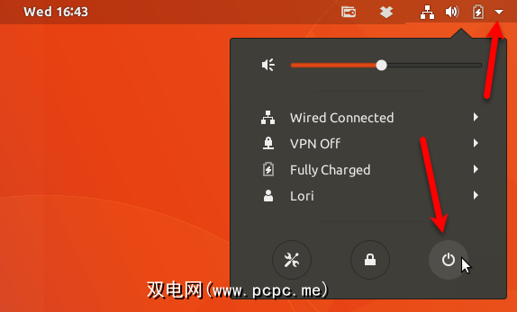 要重新启动Ubuntu,请单击屏幕右上角的向下箭头,然后单击电源图标。