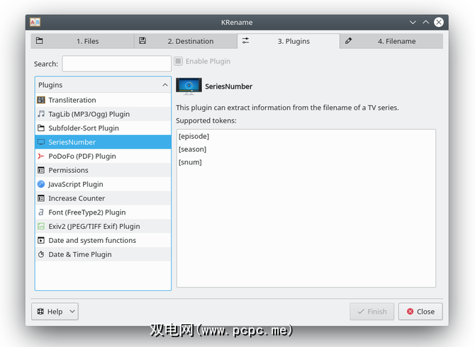 KRename的功能来自于插件,后者占据了第三个选项卡。您可以启用更多高级功能,例如将文件名从另一种语言音译为英语的能力。得益于KDE程序之间的良好集成,您可以从默认文件管理器Dolphin轻松访问KRename。以下命令: