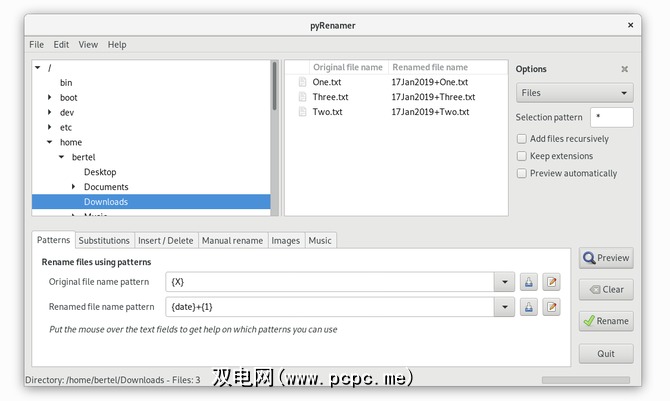 打开pyRenamer时,您会在左侧看到一个浏览窗格,用于浏览文件夹,在右侧看到一个窗格,用于选择文件。后者将显示重命名之前和之后的文件外观。右侧的选项面板可让您保留文件扩展名并自动预览更改。