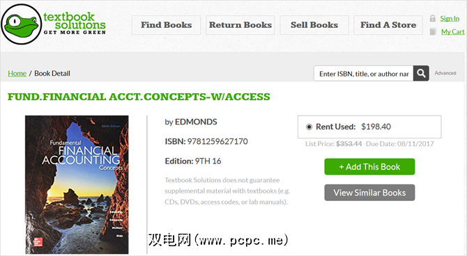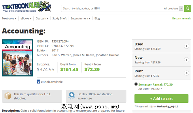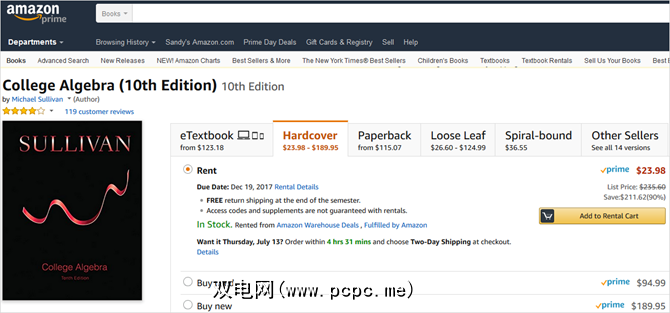 如果您已经在亚马逊上购物,则可以通过其计划轻松租借教科书。只需在搜索框中弹出所需书籍的详细信息,然后查看您的租赁选项即可。选择这本书,然后查看其他信息,包括租金。订单金额超过$ 35则免运费,并且Amazon Prime的免费两日送货服务。