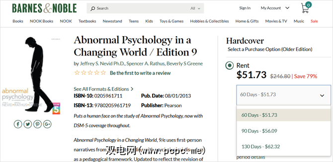 另一个具有租赁计划的热门图书卖家是Barnes&Noble。只需搜索您的教科书,从结果中选择正确的教科书,然后获取详细信息。您可以选择60、90或130天的租金,并可以根据需要延长租金。