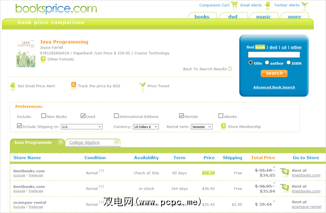 单击所需租赁旁边的商店链接,您将被带到该站点以开始该过程。 BookSprice还使用您喜欢的RSS通过电子邮件提供价格警报和价格跟踪。