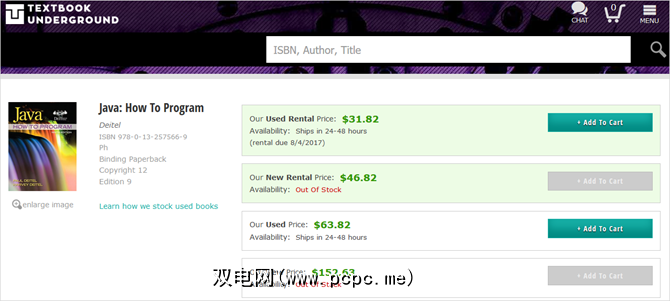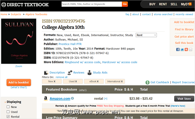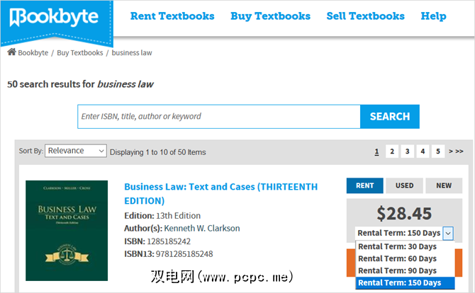 BooksPrice是一个很好的网站,可为教科书租赁找到合适的价格。使用搜索工具查找书籍后,您会看到购买和租赁的结果。只需在结果上方的首选项下取消选择购买选项,然后选中租赁以缩小选择范围。然后,查看各个书店的库存情况,期限,价格和运输成本。