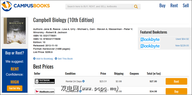 要一次搜索多个租赁站点,您还可以查看CampusBooks.com。找到书后,您将看到最优惠的价格以及所有书店的价格。您可以查看条件详细信息,运输成本和任何可用的优惠券。