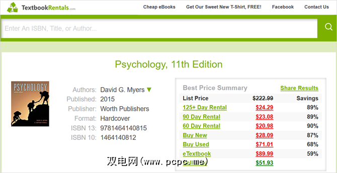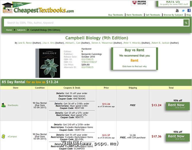 CheapestTextbooks.com是另一个为您搜索各种书店的网站。搜索并找到您的书,然后浏览所有选项。结果页面可按学期租金和特定天数方便地进行排序。与类似的站点一样,显示的详细信息包括条件,优惠券,交易和运输成本。