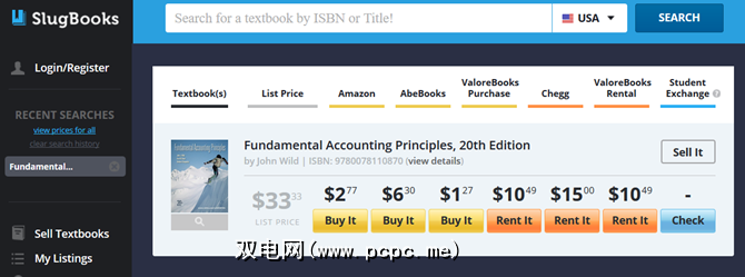如果您居住在加拿大,英国或澳大利亚,则SlugBooks是您想要的网站。 (在美国也可以租借)。该网站搜索了您所在国家/地区的多家在线书店,并在卖方下方整齐地显示每个价格。然后,只需单击以前往书店租书。