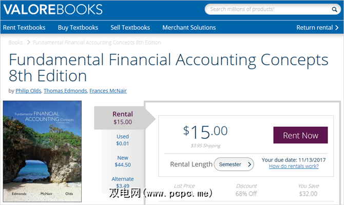 ValoreBooks是另一个出租教科书的绝佳来源。找到您的书,然后从一个学期或一个季度的租期中选择。清楚地显示了向您的运输费用,但您可以免费退还书籍。